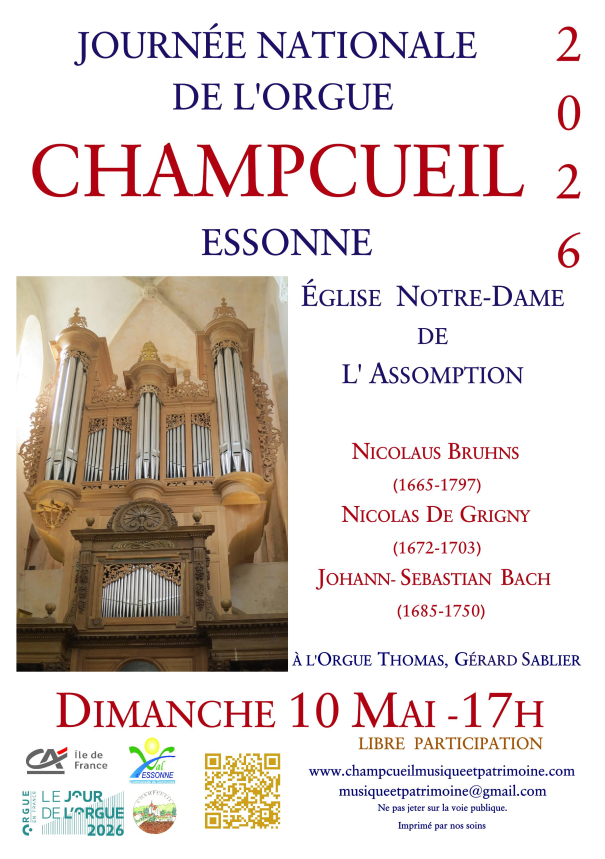 Mai, 2026 Eglise de Champcueil91750 Champcueil 10mai17:0019:00Journée nationale de l'orgueChampcueil Détails de l'évènement Détails de l'évènement Dates (Dimanche) 17:00 - 19:00(GMT-11:00) View in my time LieuEglise de Champcueil91750 Champcueil CalendrierGoogleCal Organisateur Association Musique et Patrimoine à Champcueilmusiqueetpatrimoine@gmail.com