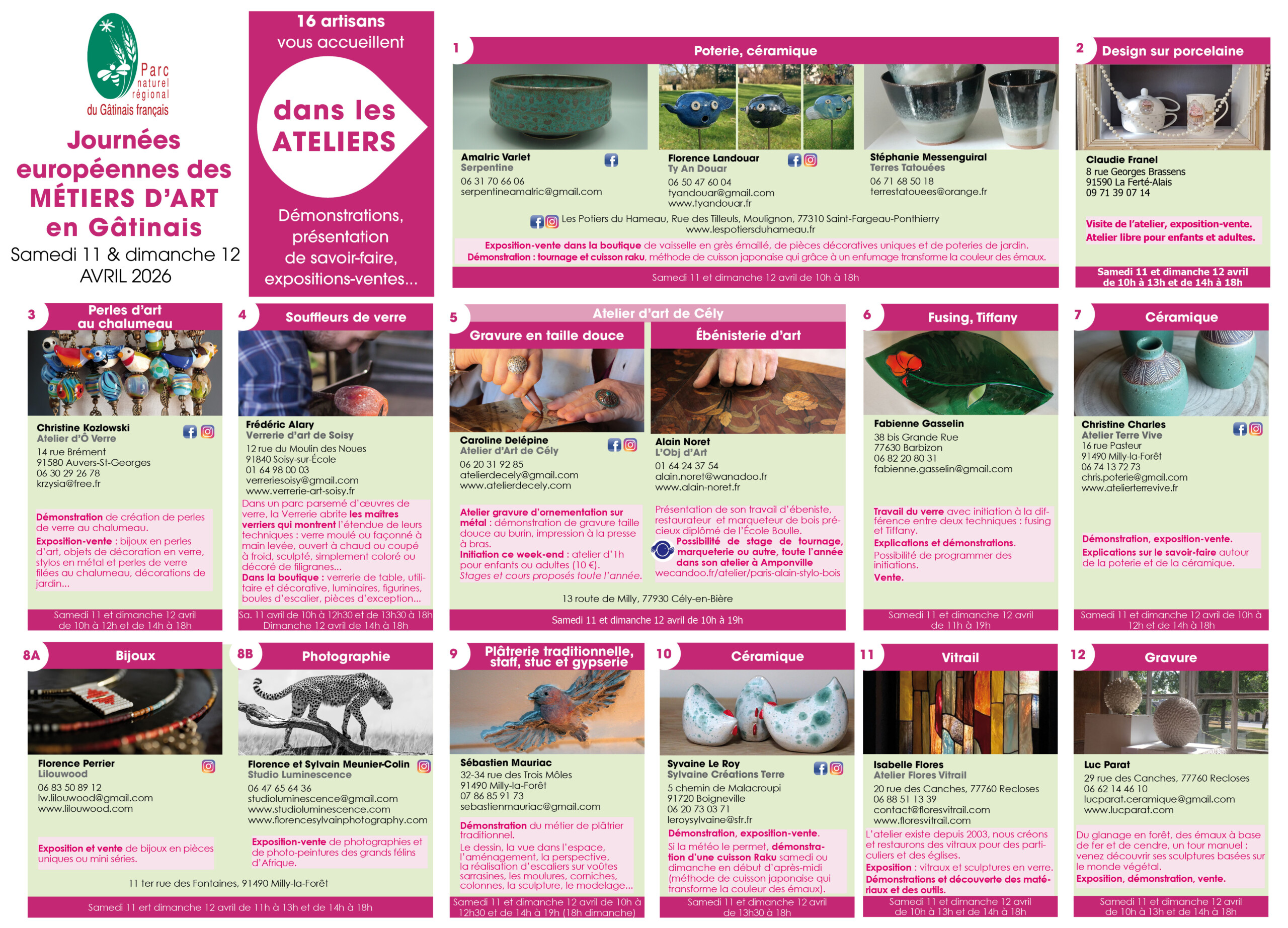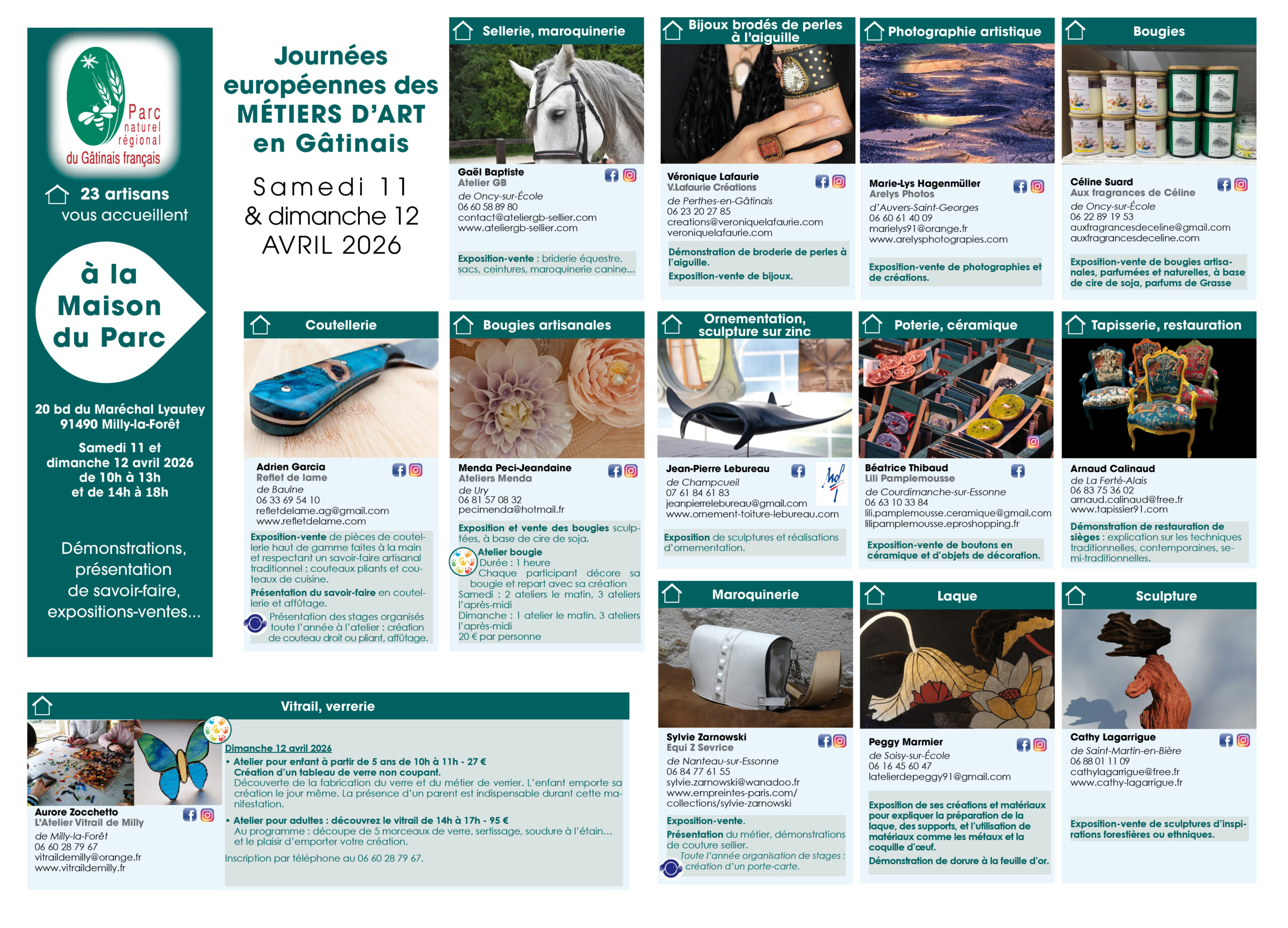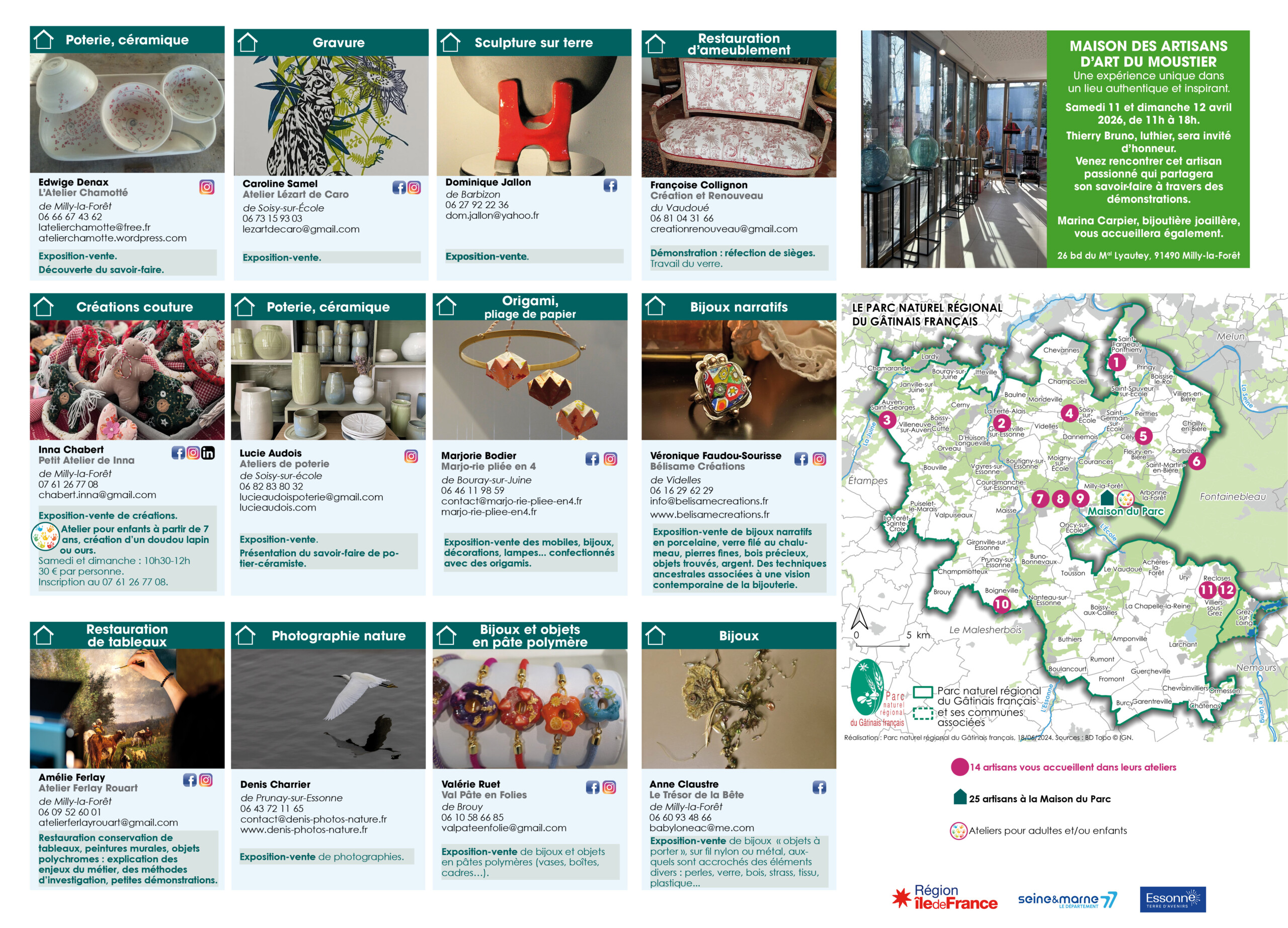 Voir l'image agrandie Les Journées européennes des Métiers d’art 41 artisans vous accueillent samedi 11 et dimanche 12 avril ! – dans leurs ateliers, – à la Maison du Parc à Milly-la-Forêt, – à la Maison des Artisans d’art du Moustier à Milly-la-Forêt. Dans les ateliers des artisans d’art A la Maison du Parc à Milly-la-Forêt Parc du Gâtinais2026-03-30T14:10:49+01:00 Partagez cet article sur les réseaux sociaux FacebookXLinkedIn